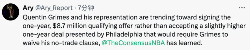 根据之前报道,76人为格兰姆斯开出的新合同报价为4年3900万美元,格兰姆斯团队根本不会考虑这份不靠谱的报价。