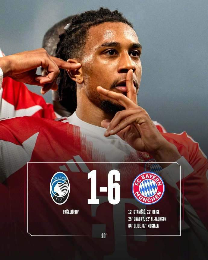 从本场比赛的进程来看,这根本不是一场势均力敌的对抗,而是一场成年队对青年队的教学赛。开场仅12分钟,斯塔尼希奇就通过角球战术成功偷袭敲开了亚特兰大的大门,那一刻,潘多拉的魔盒就此打开。此后奥利塞这位拜仁的“左脚魔术师”,在本场比赛中彻底杀疯了。传射建功、内切兜射,他把亚特兰大的防线过得像清晨的马路,一个人就刷爆了进攻数据。格纳布里、雅克松、穆西亚拉轮番开火,整个下半场,拜仁简直是在进行半场攻防演练。